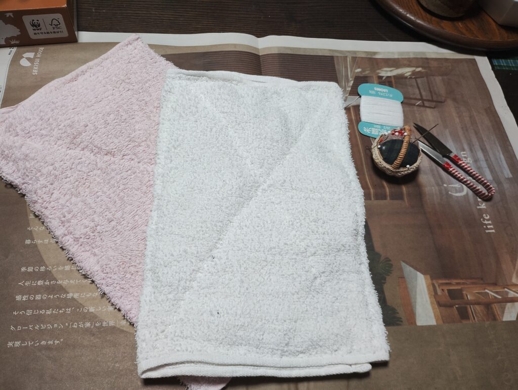 今日は、古タオルで雑巾づくり、紅白雑巾を作りしました。