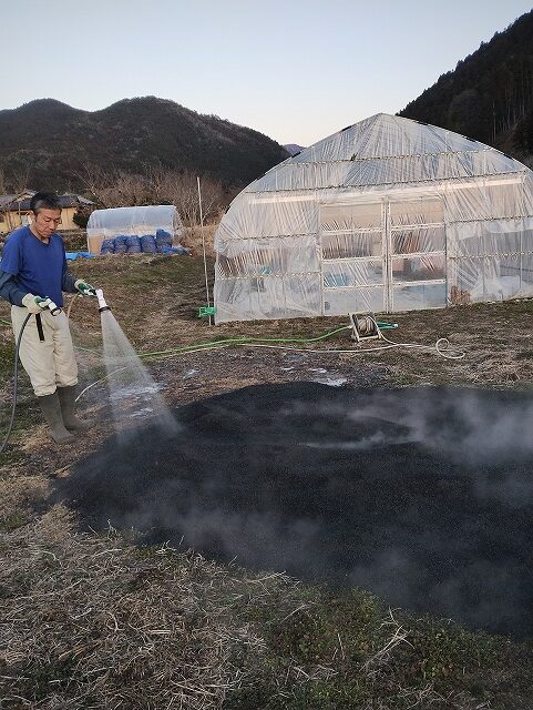 できあがった燻炭が放置すると、灰になってしまうのを防ぐためしっかり水をかけ温度を下げておきます。