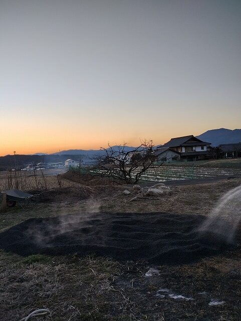 2,3時間ほどは、放置しても大丈夫です。燻炭器の熱がもみ殻に点火しじわじわと炭化してきます。