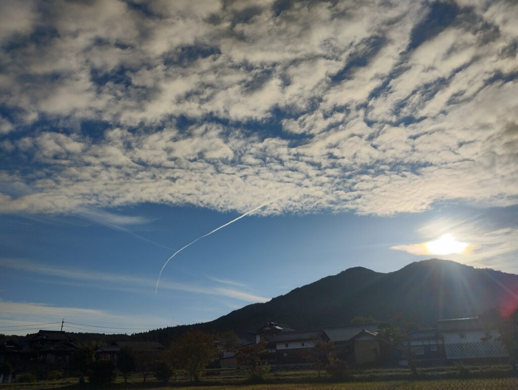 きれいに飛行機雲が山の周りを描いていました。