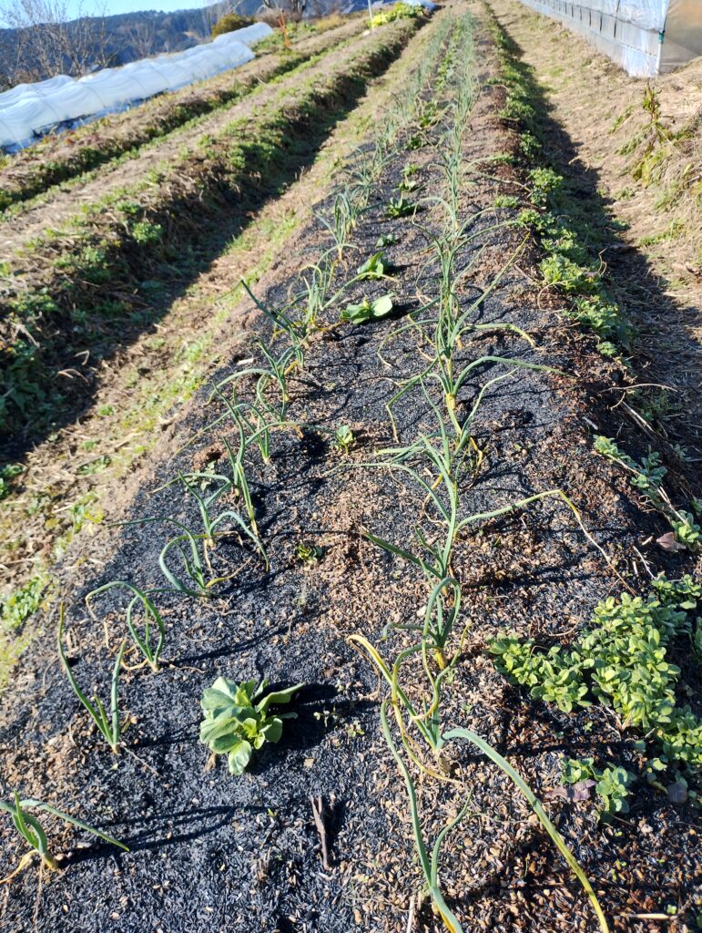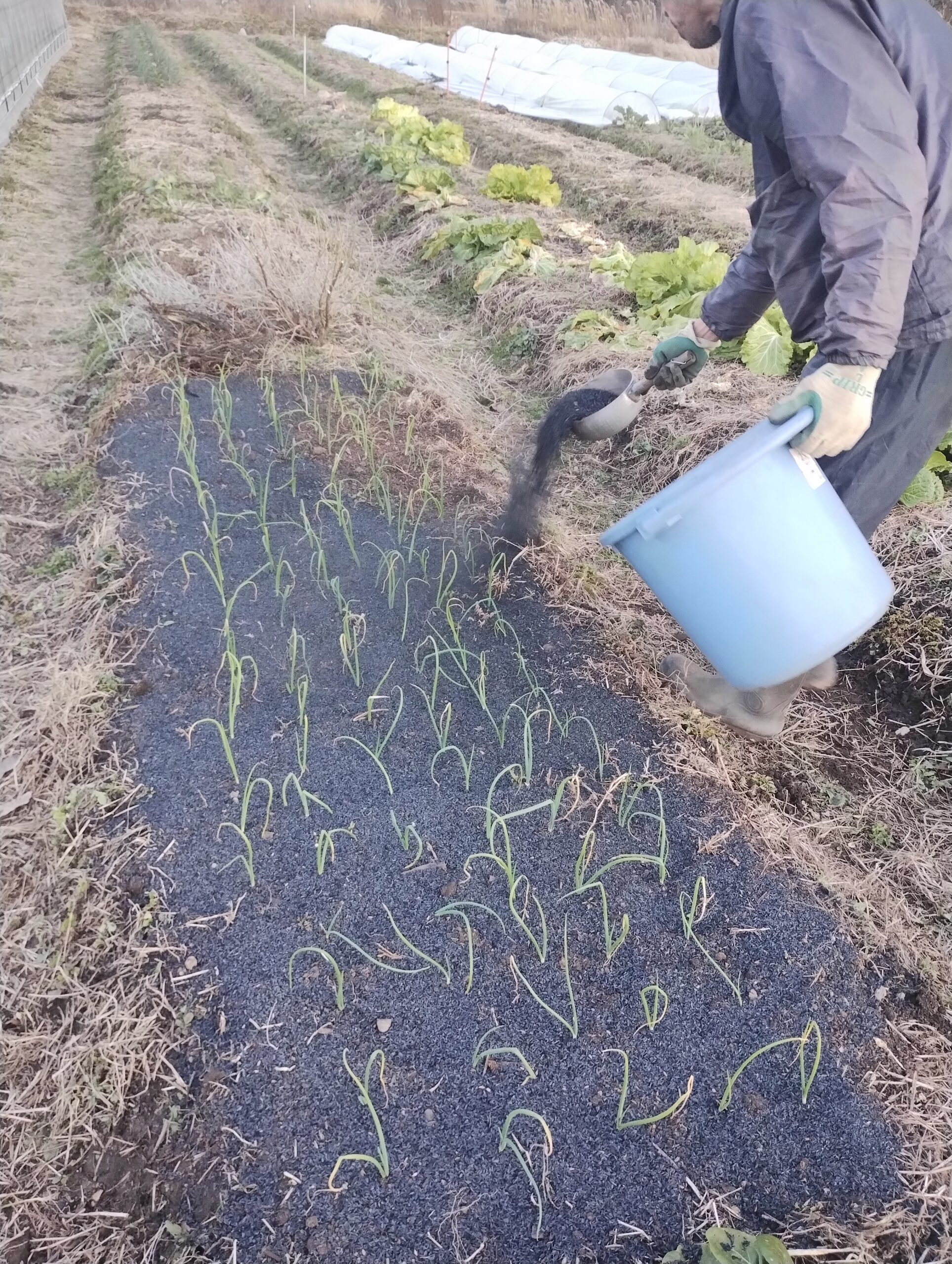 冬場夜間は、氷点下にもなるため黒ビニールマルチの代わりに、もみ殻燻炭をしっかり撒いておきます。