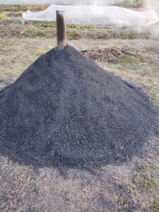 上着を一枚羽織り、今日は農夫に代わり嫁が畑の見回りをします。ビニールハウス前の空き地には、大量のもみ殻燻炭を天日干ししていましたが、今朝は白いもみがら燻炭ではないですか!