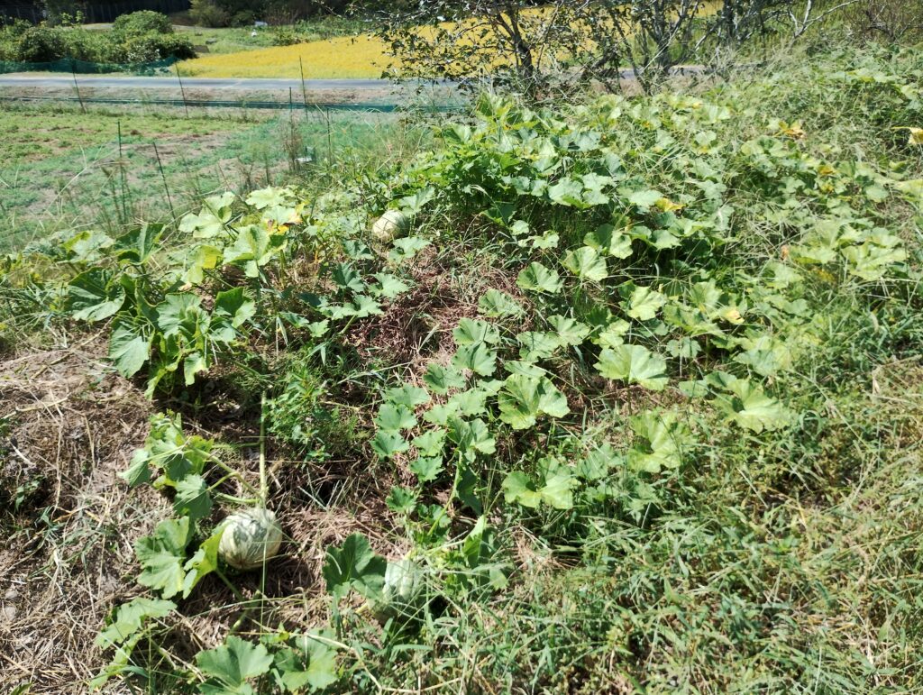 農園のかぼちゃは、上の畑から下の畑の土手を伝い伸びるよう農夫が植えていました。農夫の狙いどおりに土手沿いに伸びた苗もあれば、上の畑に伸びて、なすの畝の下に伸びた苗もありました。