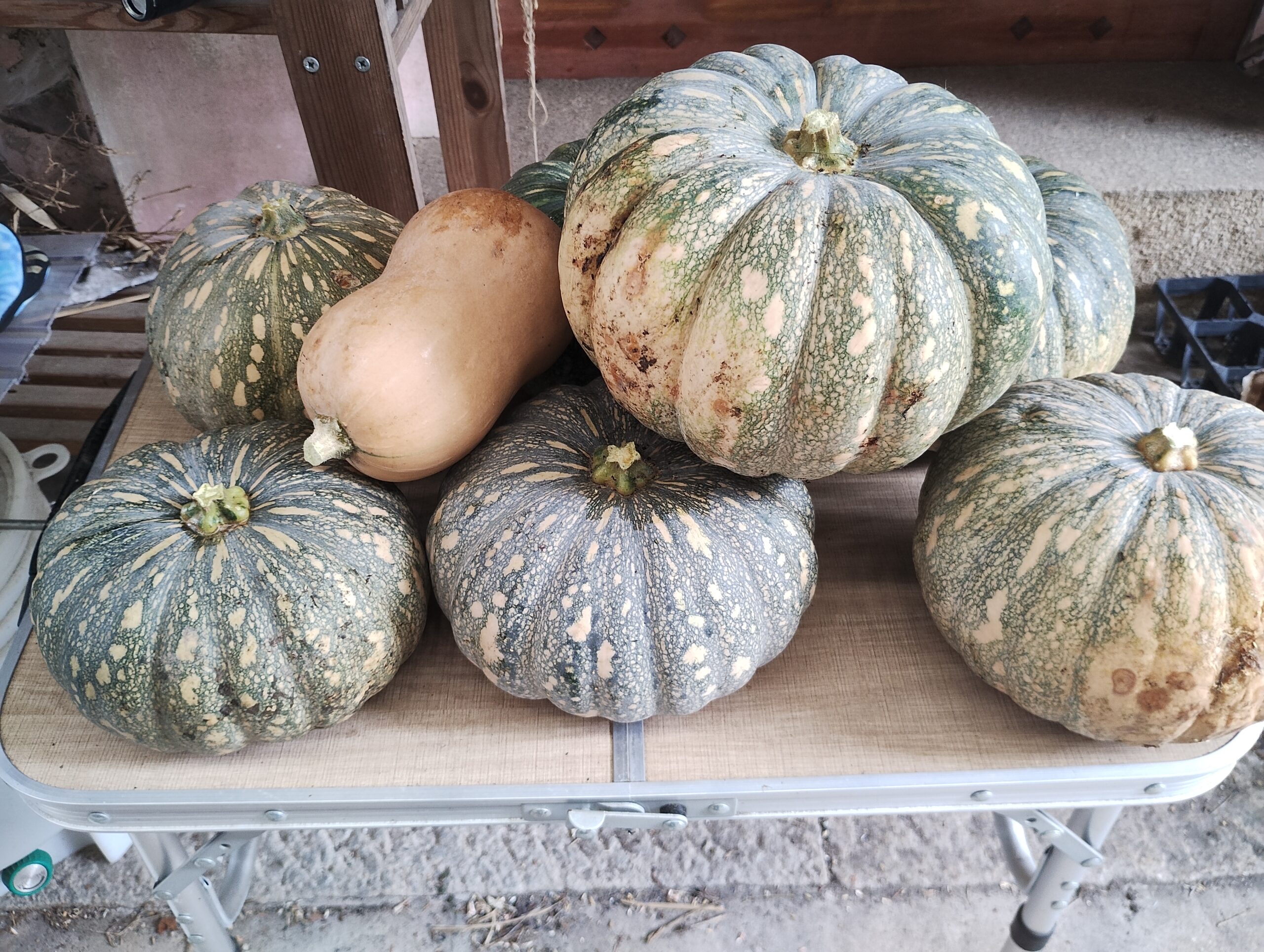 かぼちゃは4種類植え付け、一番実をつけてくれたのは、島カボチャ、次にバターナッツ、黒皮栗カボチャ。できがよくなかったものは長野在来ハッパードです。